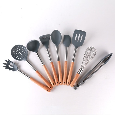 Utensilios de cocina de silicona con mango de madera, utensilios de cocina de estilo novedoso, venta al por mayor